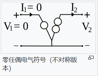 零任偶(nullor)是一種理想的二端口網絡,輸入端為零極子,輸出端為任意子,零任偶類似一個理想的放大器,其電壓增益、電流增益、跨導增益和跨阻抗(transimpedance)增益都是無限大。其傳輸參數都為0,也就是說,其輸入-輸出關系可以用以下的矩陣方程式表示。